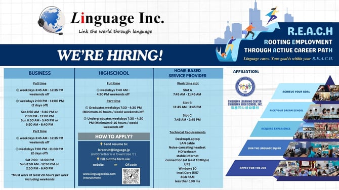 𝙏𝙚𝙖𝙘𝙝 𝙊𝙉𝙇𝙄𝙉𝙀 𝙬𝙞𝙩𝙝 𝙪𝙨! 𝘼𝙥𝙥𝙡𝙮 𝙬𝙝𝙞𝙡𝙚 𝙃𝙄𝙍𝙄𝙉𝙂 𝙞𝙨 𝙤𝙥𝙚𝙣. options for application: •visit us onsite >Units B&C, 6th Floor, Park Centrale Building,J. M. Del Mar Street, Cebu IT Park,Apas, Cebu City 6000 •register via https://forms.gle/1tyeToAFyLdiuoYn7 •email CV to lsrecruit@linguage.jp
