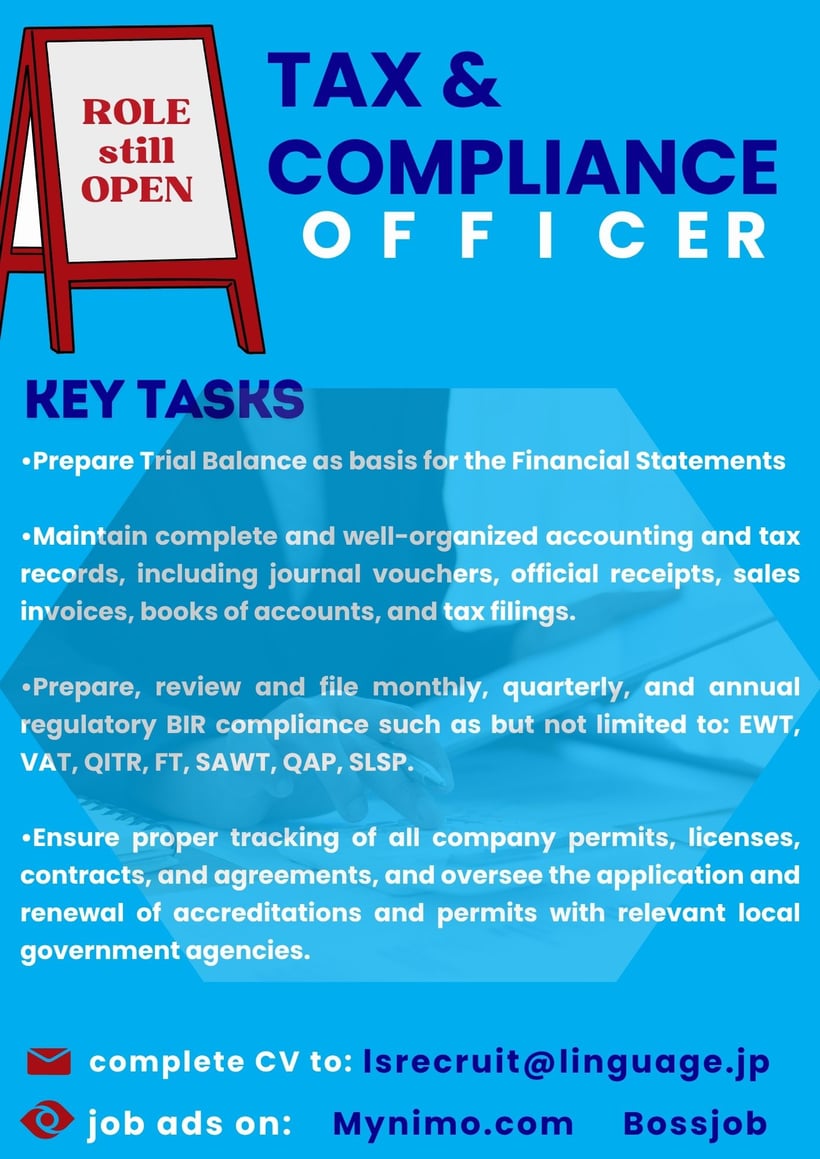 •●◉✿ “𝙂𝙤𝙤𝙙 𝙣𝙚𝙬𝙨 — 𝙩𝙝𝙞𝙨 𝙤𝙥𝙥𝙤𝙧𝙩𝙪𝙣𝙞𝙩𝙮’𝙨 𝙨𝙩𝙞𝙡𝙡 𝙪𝙥 𝙛𝙤𝙧 𝙜𝙧𝙖𝙗𝙨!” ✿◉●•◦ == Qualifications == •Graduate of a Bachelor's Degree in Accountancy or BS in Management Accounting, Financial Management or Business Administration •At least 1 year experience in tax and compliance in the corporate setting •Strong attention to detail and excellent organizational skills •Strong communication skills •Knowledge of BIR, SEC, LGU regulations and requirements •At least 1 year work experience in facilitation of Tax / BIR Compliance #WeAreHiring #TaxAndCompliance #TaxOfficer